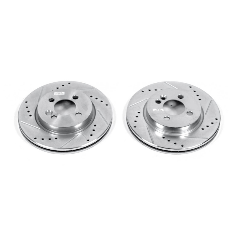 Power Stop drilled and slotted rotors provide a bolt-on upgrade for improved brake cooling and performance. Precision cross-drilled for maximum cooling and maximum performance during extreme conditions; rounded slots sweep away gasses, dust, and moisture to keep a clean friction contact patch on the rotor surface. Silver zinc dichromate plating resists rust and corrosion. With a direct OE fit, there are no special modifications needed.. Manufactured to strict tolerances for DTV and runout for smooth quiet performance. Power Stop 07-09 Mini Cooper Front Evolution Drilled & Slotted Rotors - Pair. PowerStop Evolution Performance Drilled, Slotted & Plated Brake Rotor Pair. Precision cross-drilled for maximum cooling and optimum performance. Chamfered drill holes and rounded slots to minimize stress cracking. Bolt-on upgrade for stock brakes, no modifications necessary. Slotted friction surface sweeps away gasses, dust, and water. EVOLUTION DRILLED & SLOTTED ZINC PLATED ROTORS (PAIR). Weight and vane count match original equipment design. Zinc plated for protection against corrosion. 100% dynamic mill balanced. Disc Brake Rotor Set. Sold as a pair. PowerStop XPR