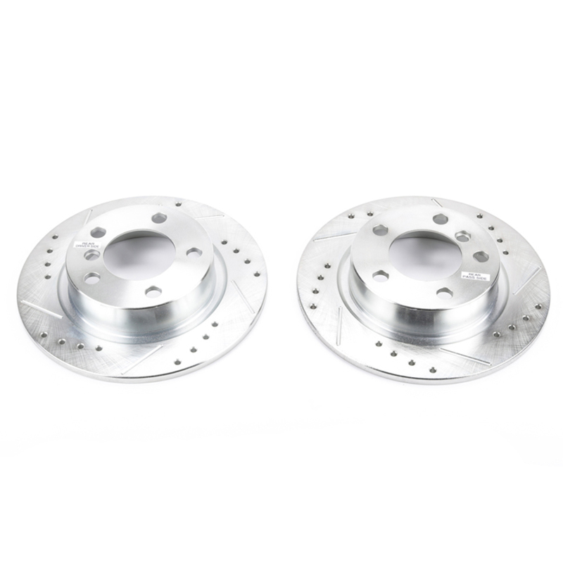 Power Stop drilled and slotted rotors provide a bolt-on upgrade for improved brake cooling and performance. Precision cross-drilled for maximum cooling and maximum performance during extreme conditions; rounded slots sweep away gasses, dust, and moisture to keep a clean friction contact patch on the rotor surface. Silver zinc dichromate plating resists rust and corrosion. With a direct OE fit, there are no special modifications needed.. Power Stop 11-16 Mini Cooper Countryman Rear Evolution Drilled & Slotted Rotors - Pair. Manufactured to strict tolerances for DTV and runout for smooth quiet performance. PowerStop Evolution Performance Drilled, Slotted & Plated Brake Rotor Pair. Precision cross-drilled for maximum cooling and optimum performance. Chamfered drill holes and rounded slots to minimize stress cracking. Bolt-on upgrade for stock brakes, no modifications necessary. Slotted friction surface sweeps away gasses, dust, and water. EVOLUTION DRILLED & SLOTTED ZINC PLATED ROTORS (PAIR). Weight and vane count match original equipment design. Zinc plated for protection against corrosion. 100% dynamic mill balanced. Disc Brake Rotor Set. Sold as a pair. PowerStop XPR