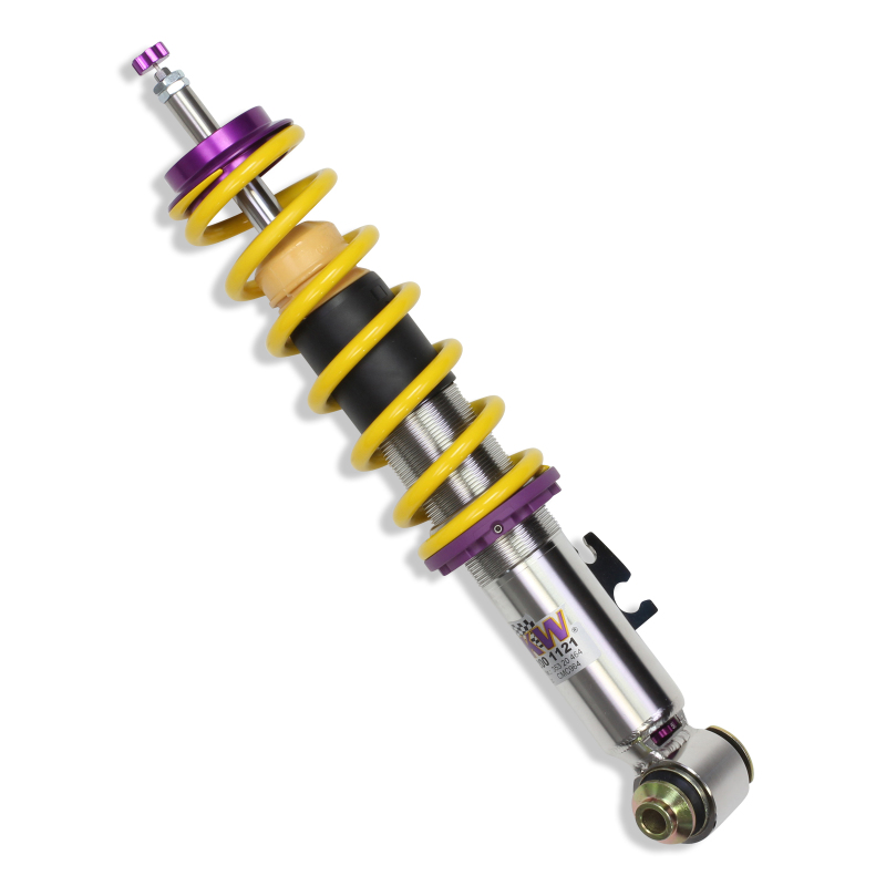 Cutting-edge motorsports technology for more performance on the road. Like every suspension product developed by KW automotive, the suspension manufacturer, and manufactured in Germany, the KW V3 Coilover suspension kit also provides a significant plus in safety reserves in road traffic. Thanks to the chassis with its high-quality dampers, springs, and elastomer spring elements, pitching and rolling movements during load changes such as evasive maneuvers, cornering, acceleration, and braking are significantly reduced. The braking distances are also shortened. Thanks to improved support and feedback, drivers not only feel safer but driving in everyday life becomes even safer. With compression and rebound stage damping, that can be set separately and independently of each other, the damper setup can be customized to your personal driving preferences or vehicle changes such as weight, tire characteristics, or altered vehicle rigidity. True performance optimization is only possible with this unique, patented system. For example, this allows the compression damping force to be increased and get more grip from the tires, to improve cornering behavior and reduce squat without simultaneously altering the rebound stage damping which is optimally matched to the spring rate, a scenario which results in reduced grip and the associated loss of performance. The KW V3 coilover kit is the ideal tool for performance-oriented drivers and experienced tuning enthusiasts who place a strong emphasis on the overall performance of their suspension. The Variant 3 features patented TVR-A and TVC-A technology that provides separately adjustable rebound a nd compression damping. The extensive adjustment range of the independently configurable rebound and compression make it easy to directly influence the steering behavior, directional stability, grip and handling characteristics for confident and repeatable results at the limit of driving dynamics.. Cutting-edge motorsports technology for more performance on the road. Like every suspension product developed by KW automotive, the suspension manufacturer, and manufactured in Germany, the KW V3 Coilover suspension kit also provides a significant plus in safety reserves in road traffic. Thanks to the chassis with its high-quality dampers, springs, and elastomer spring elements, pitching and rolling movements during load changes such as evasive maneuvers, cornering, acceleration, and braking are significantly reduced. The braking distances are also shortened. Thanks to improved support and feedback, drivers not only feel safer but driving in everyday life becomes even safer. With compression and rebound stage damping, that can be set separately and independently of each other, the damper setup can be customized to your personal driving preferences or vehicle changes such as weight, tire characteristics, or altered vehicle rigidity. True performance optimization is only possible with this unique, patented system. For example, this allows the compression damping force to be increased and get more grip from the tires, to improve cornering behavior and reduce squat without simultaneously altering the rebound stage damping which is optimally matched to the spring rate, a scenario which results in reduced grip and the associated loss of performance. The KW V3 coilover kit is the ideal tool for performance-oriented drivers and experienced tuning enthusiasts who place a strong emphasis on the overall performance of their suspension. The Variant 3 features patented TVR-A and TVC-A technology that provides separately adjustable rebound and compression damping. The extensive adjustment range of the independently configurable rebound and compression make it easy to directly influence the steering behavior, directional stability, grip and handling characteristics for confident and repeatable results at the limit of driving dynamics.. For over 20 years, KW automotive has been the market leader and driving innovation as a manufacturer of individual suspension solutions for the road and in all types of motorsports. No matter where in the world, gearheads, automobile manufacturers and reputable tuners rely on our KW coilovers "Made in Germany". Every KW coilover kit undergoes extensive stress testing before production and is developed and manufactured exclusively in our company headquarters in Fichtenberg, a small in town in Germany, to meet the high standards of our KW quality management. For us as a German manufacturer, it goes without saying that our KW coilover kits will exceed the original equipment manufacturer quality and offer useful and innovative solutions. With an application list comprising more than 4,600 options KW guarantees an outstanding selection backed by our Limited Lifetime Warranty.. TVR-A (Twin Valve Rebound - Adjustable) technology - allows oil to flow passed an adjustable, conical low-speed bypass during slow damper speeds, while at higher speed, the main rebound stage valve opens for maximum fluid displacement.. Elastomer Bump stop with integrated dust protection system prevents water and dirt particles reaching the piston rod and seals. The highly resilient bump stops act as dynamic load limiters while maintaining ride quality and durability.. Unparalleled street performance bred from motorsports heritage, the patented KW-valve technology -or the separate Adjustment -f rebound and compression damping, allows you to individually adapt the vehicle-specific base setup.. TVC-A (Twin Valve Compression - Adjustable) technology - patented compression valve allows fine tuning of low speed. During sudden high piston speeds, the low speed needle and main valve blow-off feature open to maximize flow.. Composite spring perch made from wear-resistant, friction-optimized polyamide composite encompassing a stainless-steel insert. The polyamide composite prevents oxidation while the stainless-steel insert maximizes strength.. Inox-Line Stainless Steel - Truly Permanent Corros